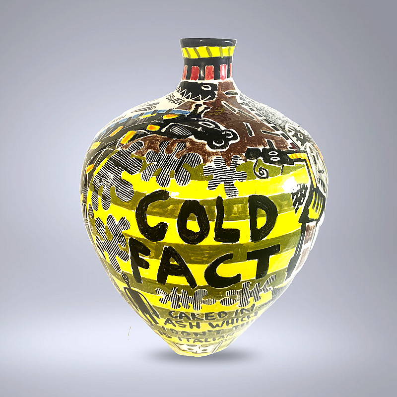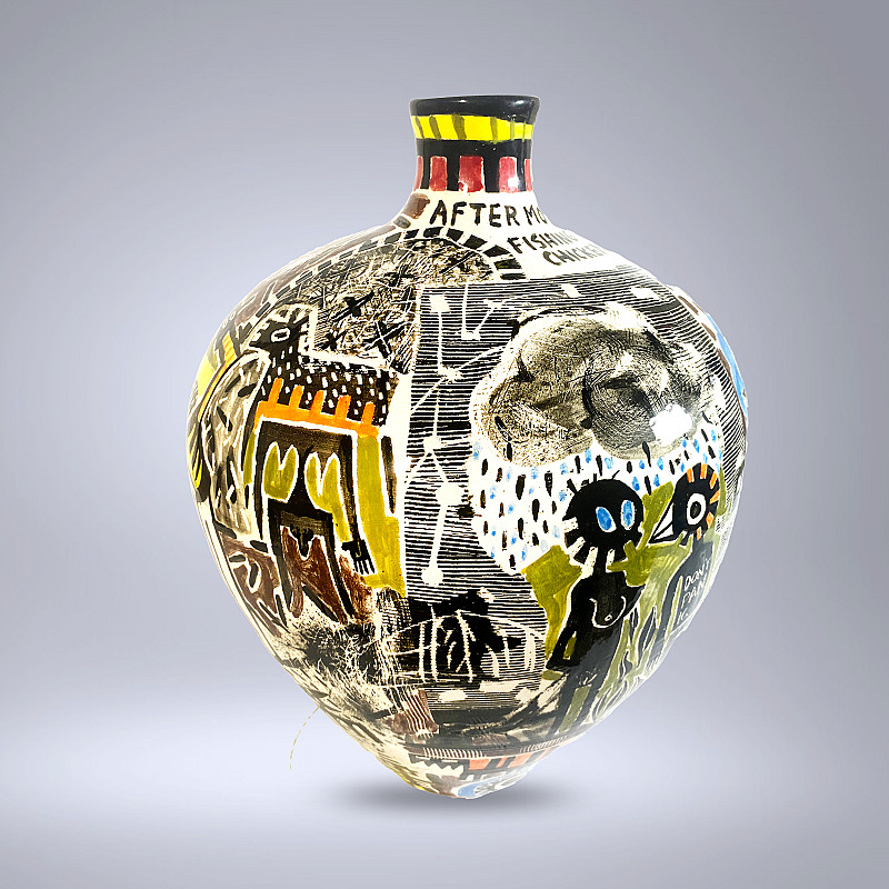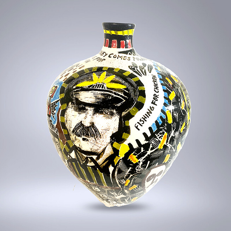 , Andrew Mogridge , slipcast stoneware ceramic pot/vase, decorated with underglaze and high-fired clear glaze