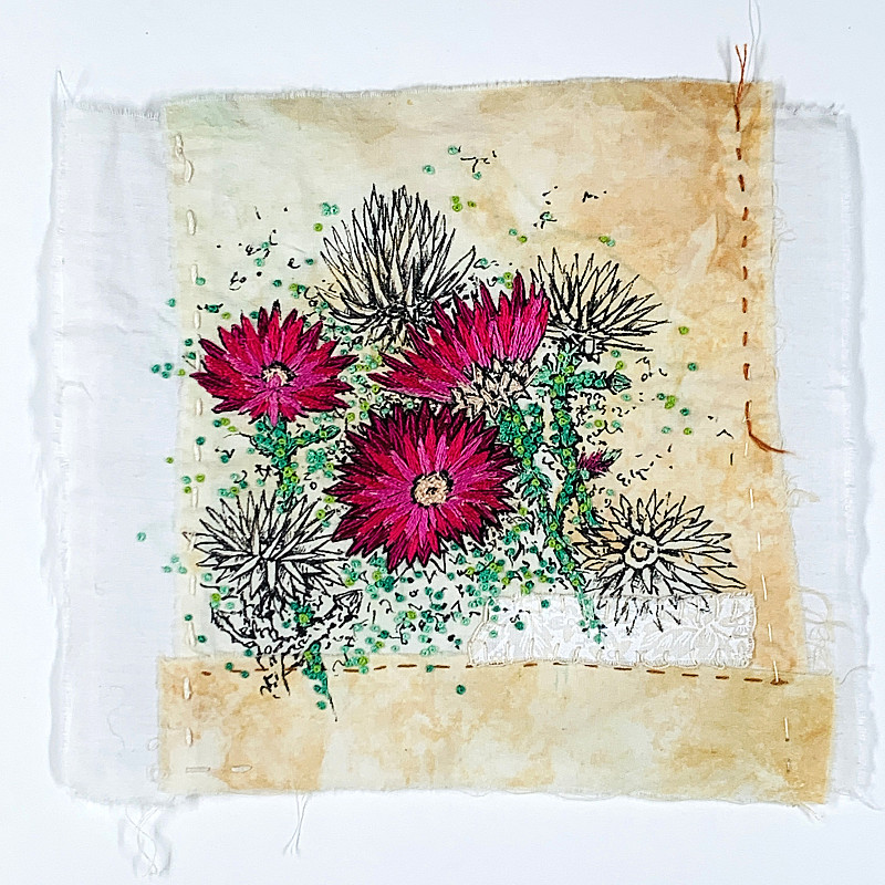 Hand stitching and drawing on fabric and teabags