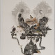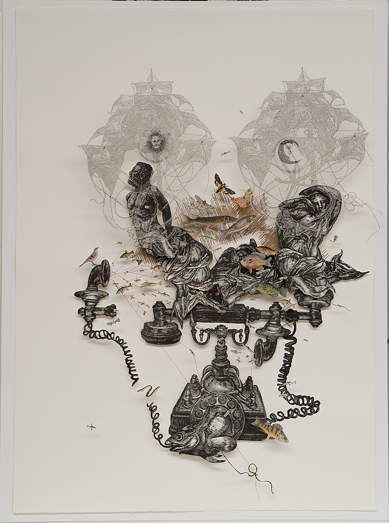 Paper sculpture with printed gauze, engraved lino, collage, etching, ento pins, text