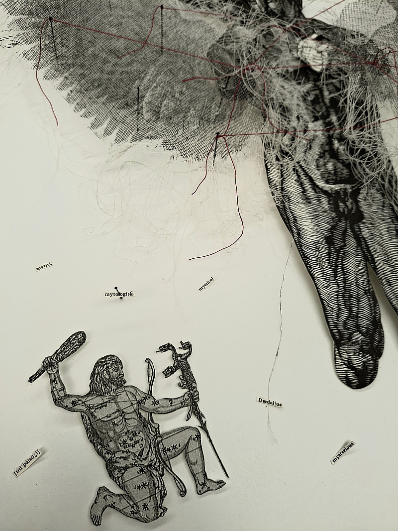 Paper sculpture with engraved lino, collage, etching, ento pins, text