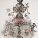 Paper sculpture with engraved lino, etching, engraving, printed gauze, rice paper, pins, collage, red thread