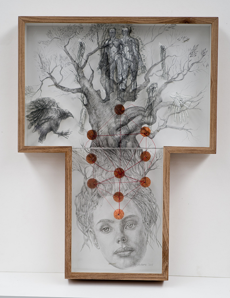 , Judy Woodborne , Paper sculpture with engraved Perspex, collage, linocut, pins and glue