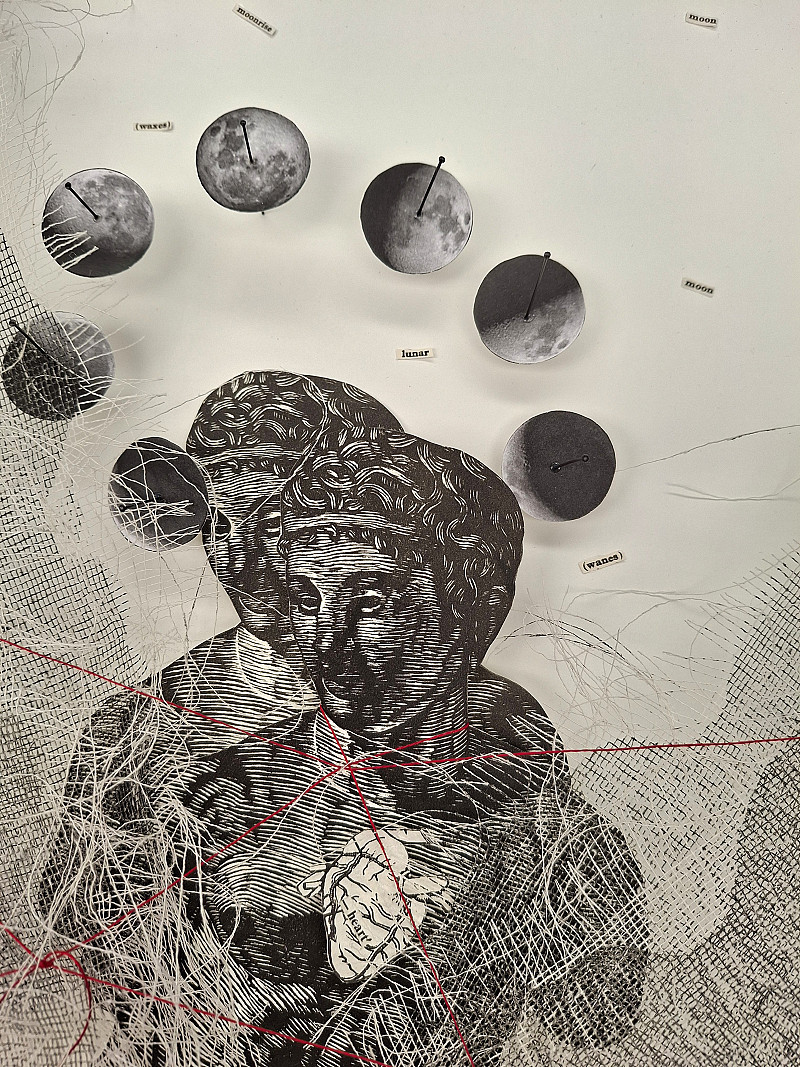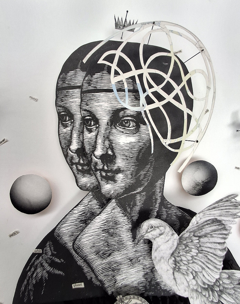 Paper sculpture with copper leaf, engraved lino, collage, etching, ento pints, text