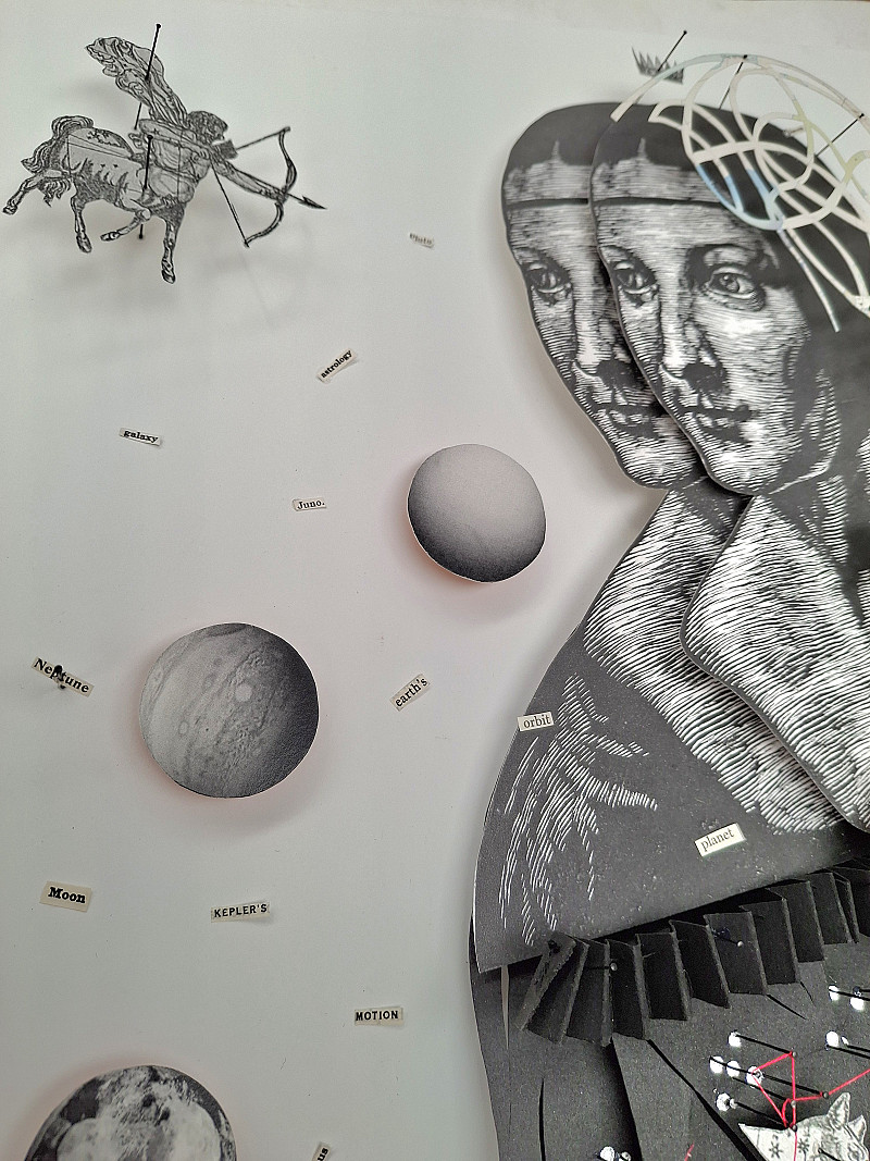 , Judy Woodborne , Paper sculpture with copper leaf, engraved lino, collage, etching, ento pints, text